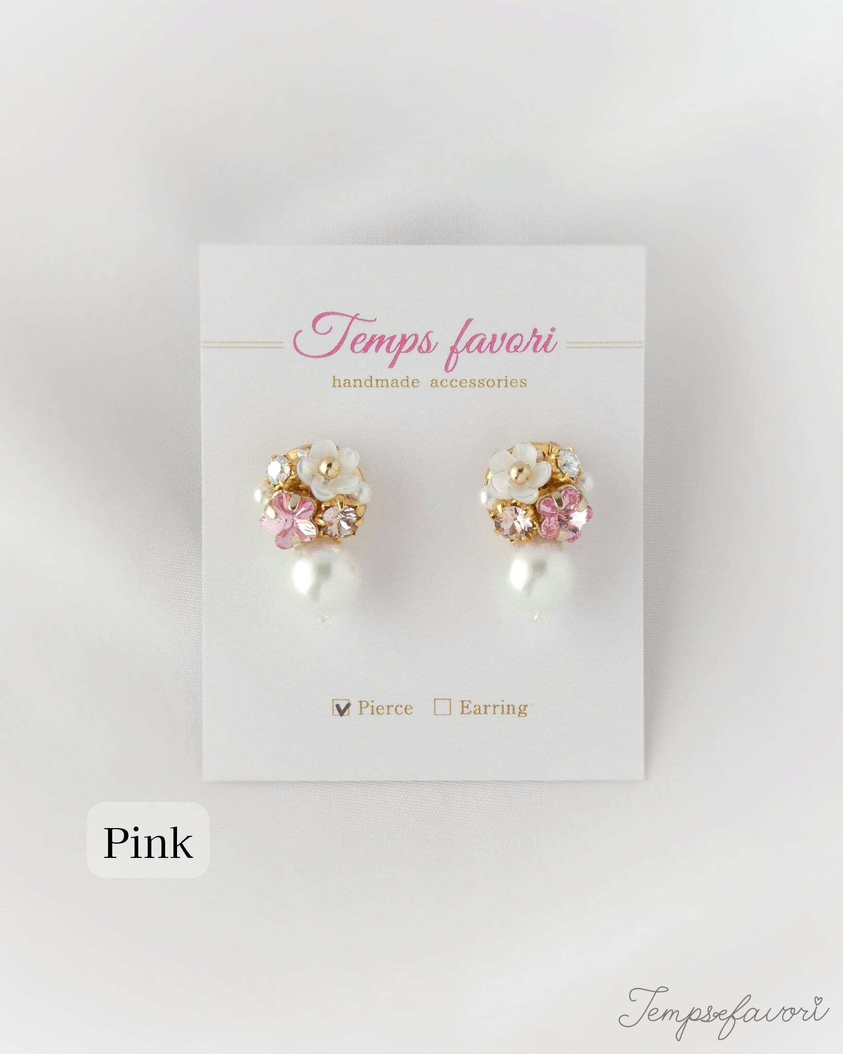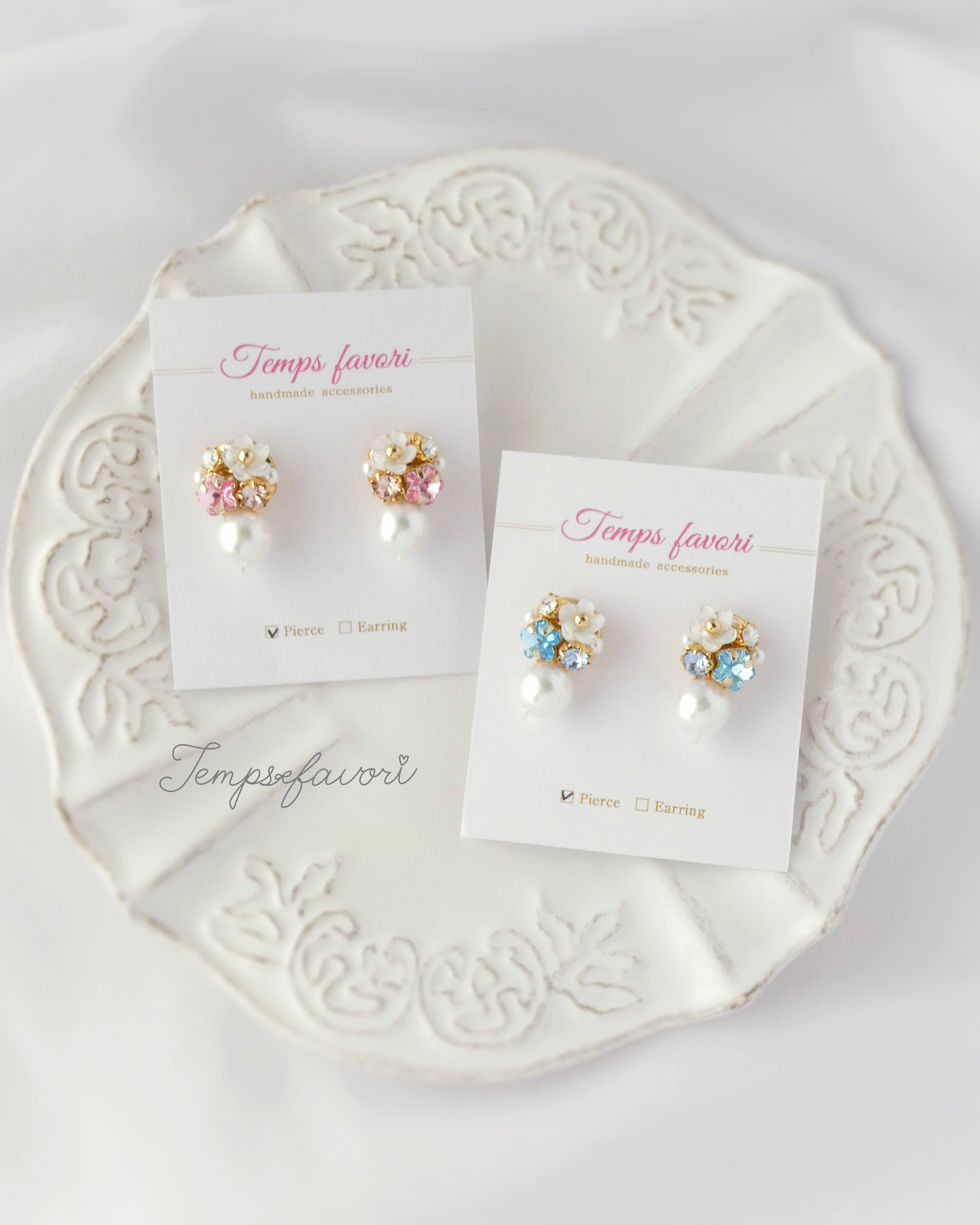 小さなお花とビジューをぎゅっと詰め込んで、大粒のパールを一粒添えて上品さと程よい存在感をプラスしました。