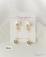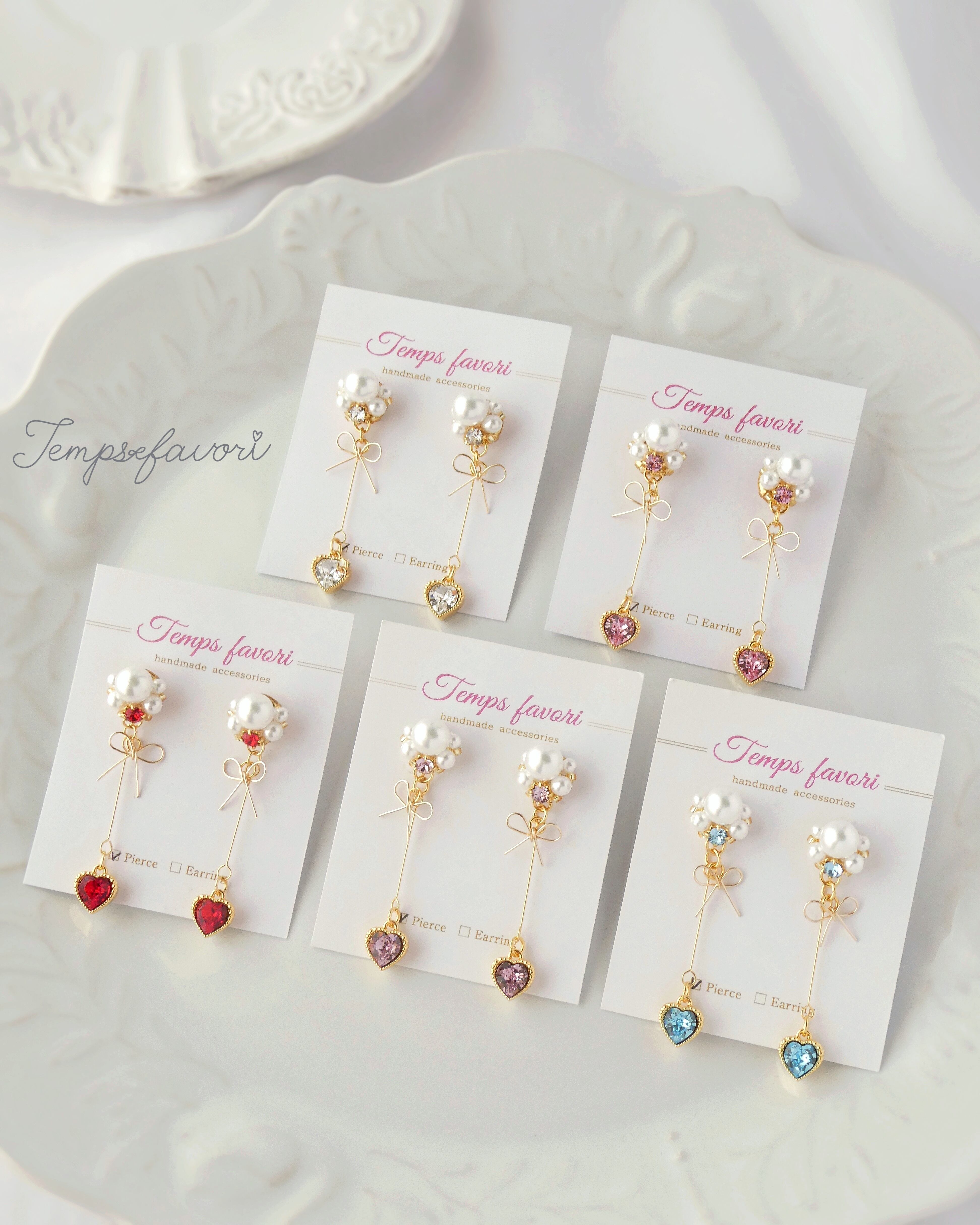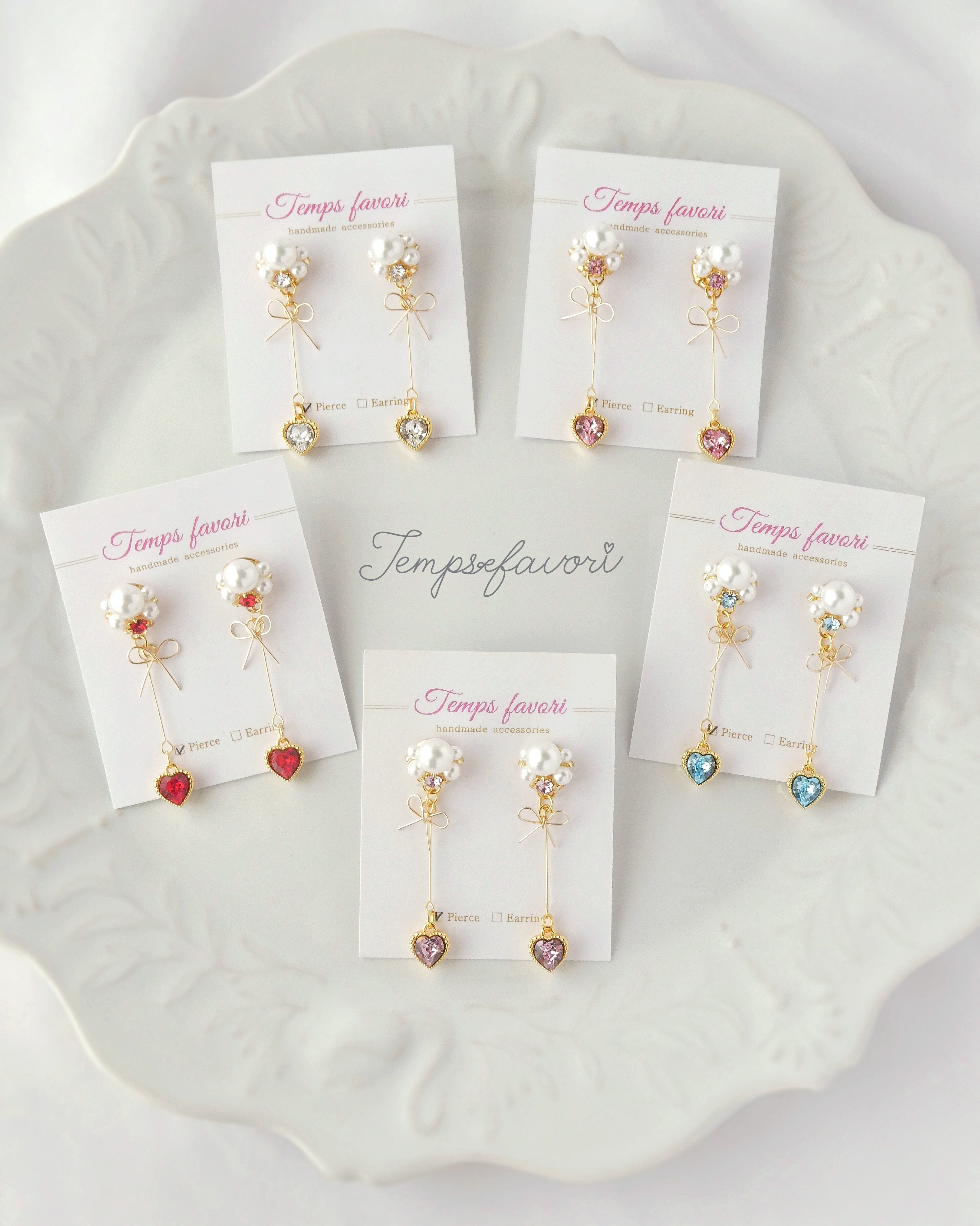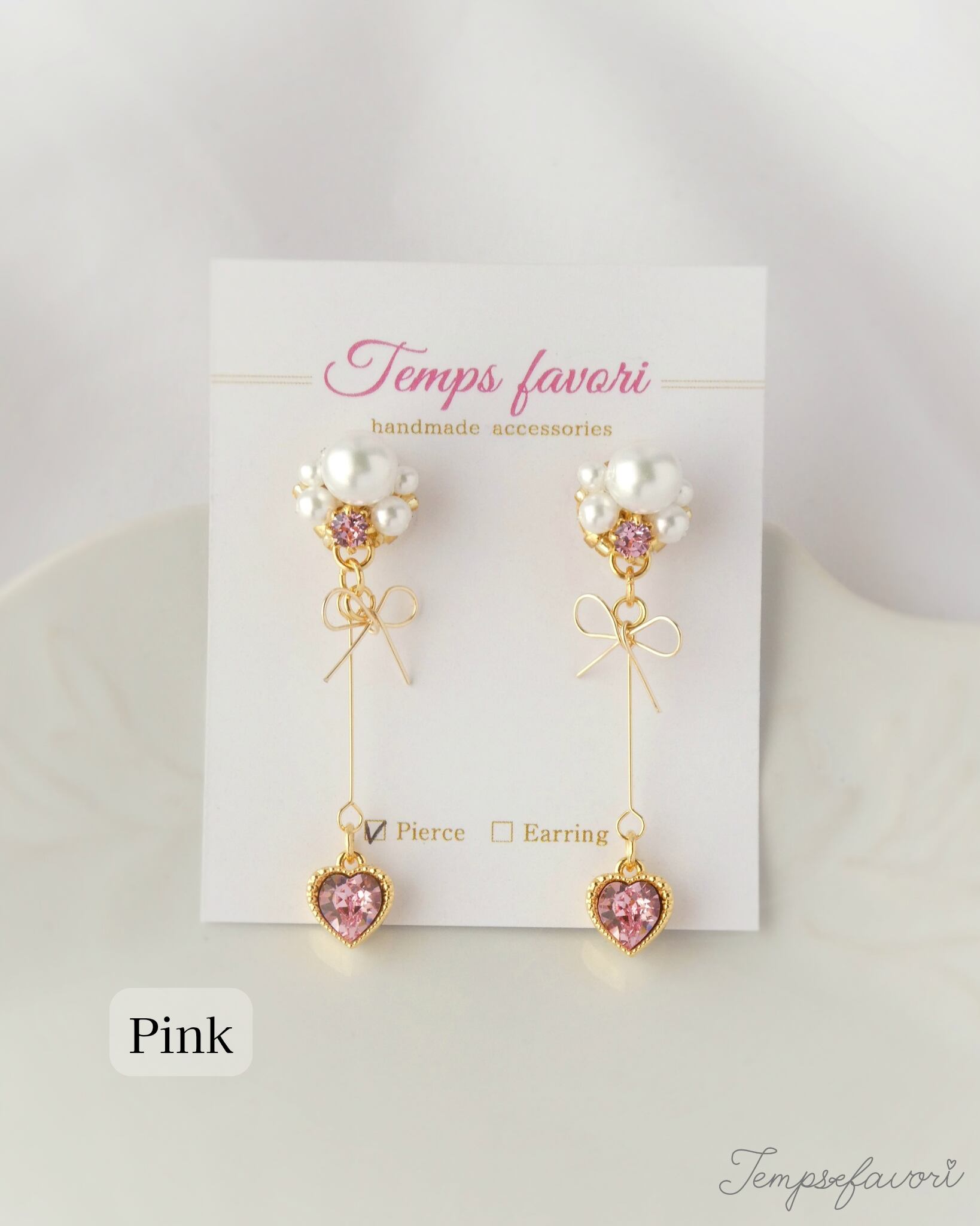 パールでまとめたトップの下で、リボンとハートが揺れる小さなビジューピアス。
