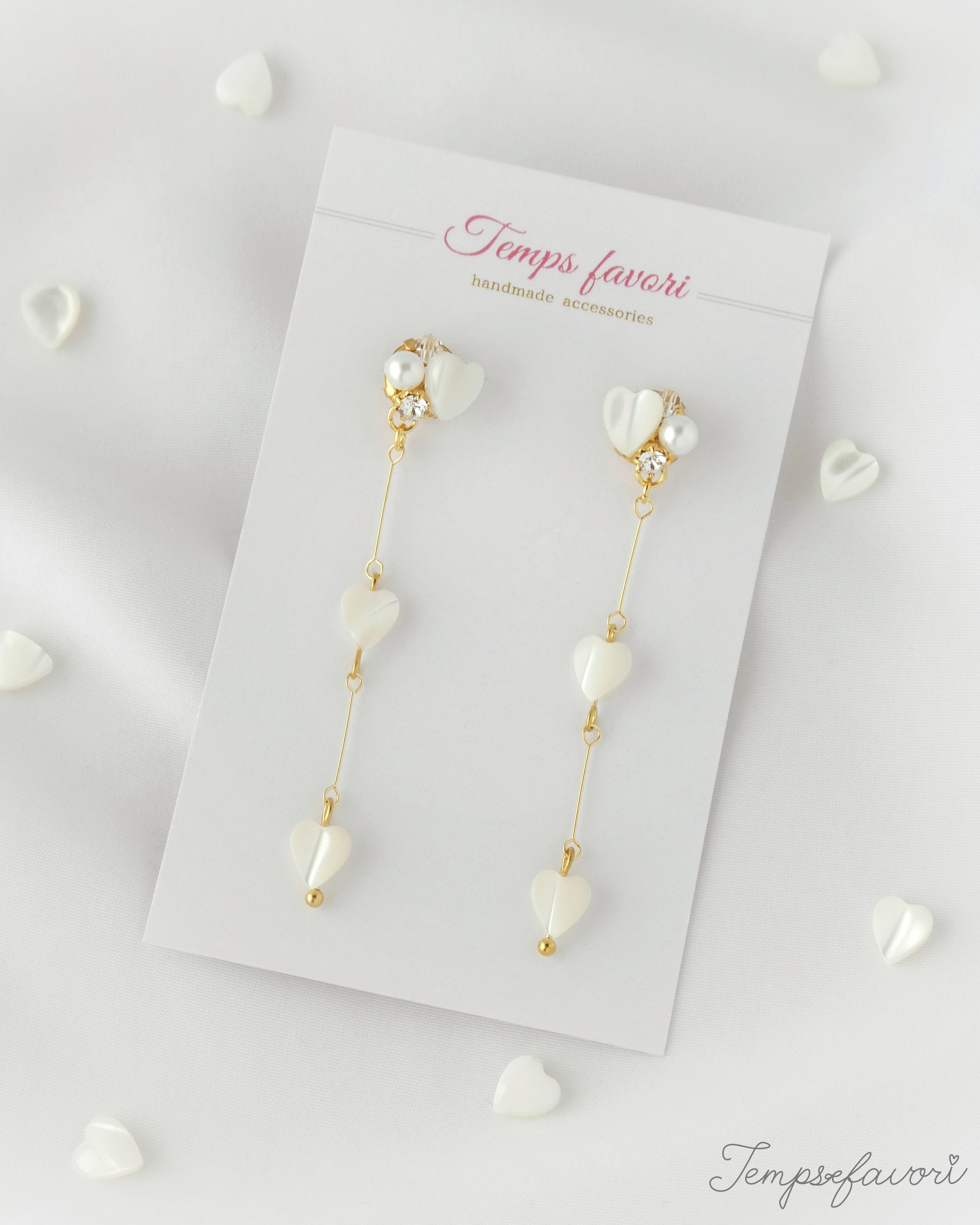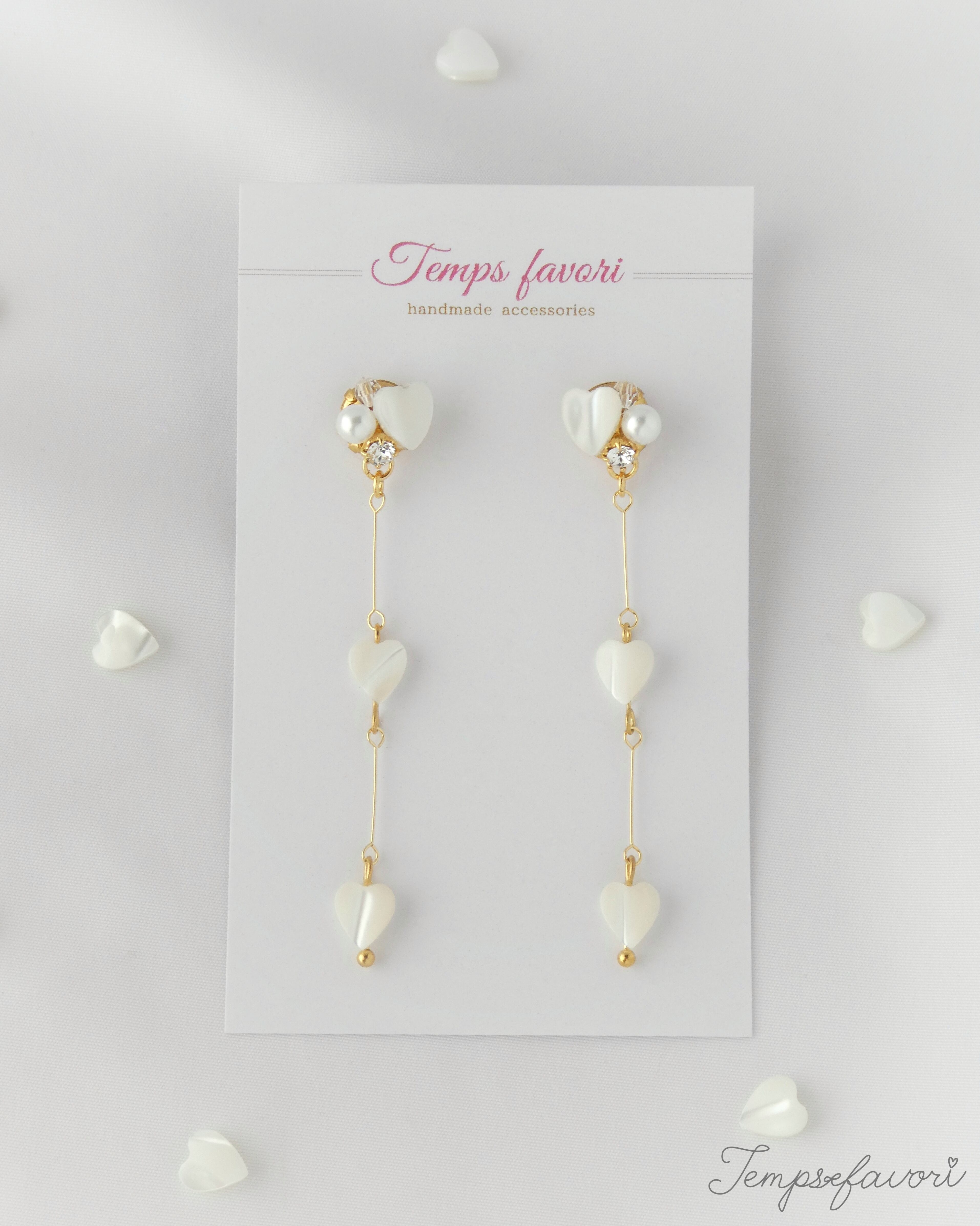 マザーオブパールのハートが揺れる小さなビジューピアス。