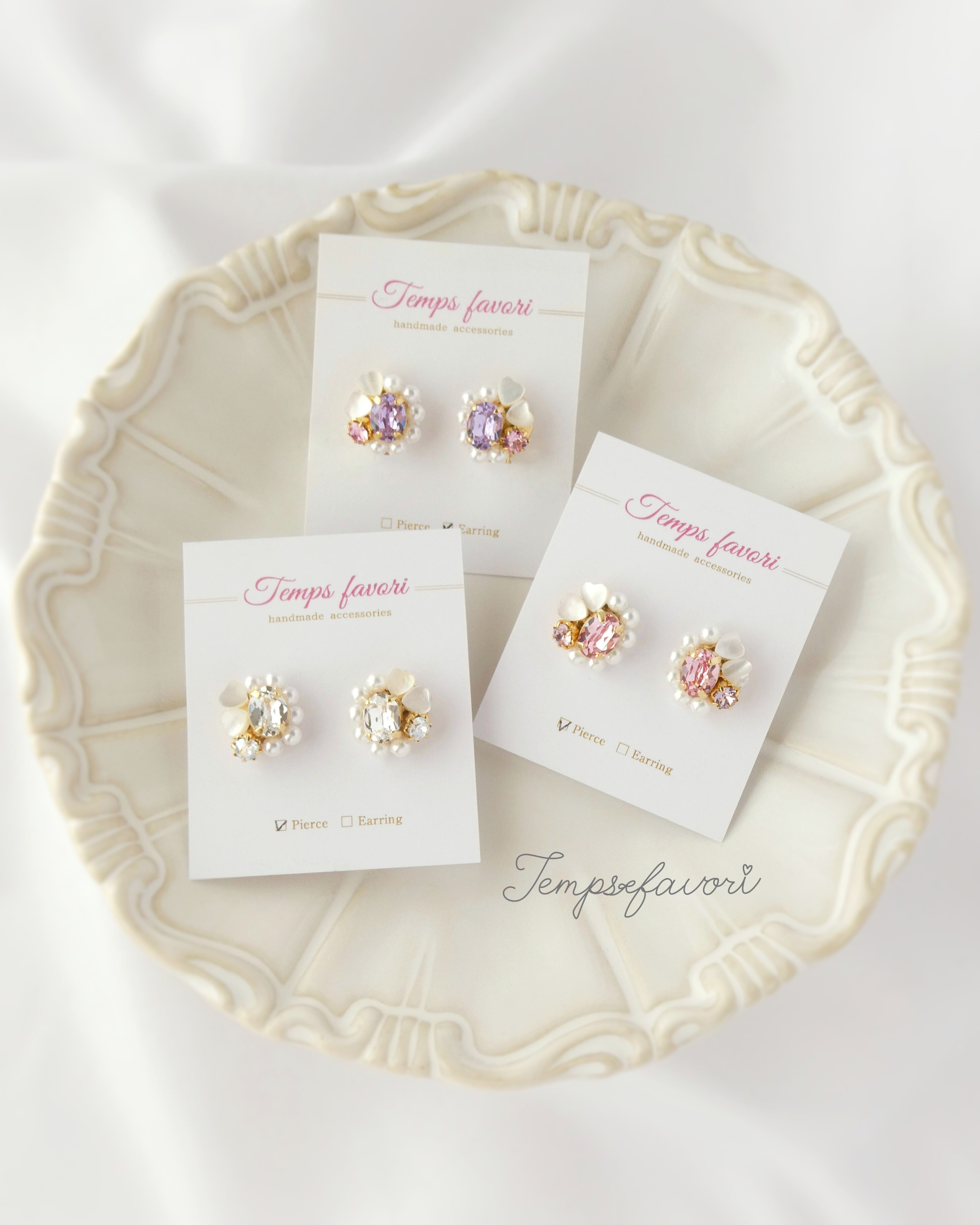 大粒のビジューにパールと小さなハートを添えた上品さと可愛さを兼ね備えたビジューピアス。