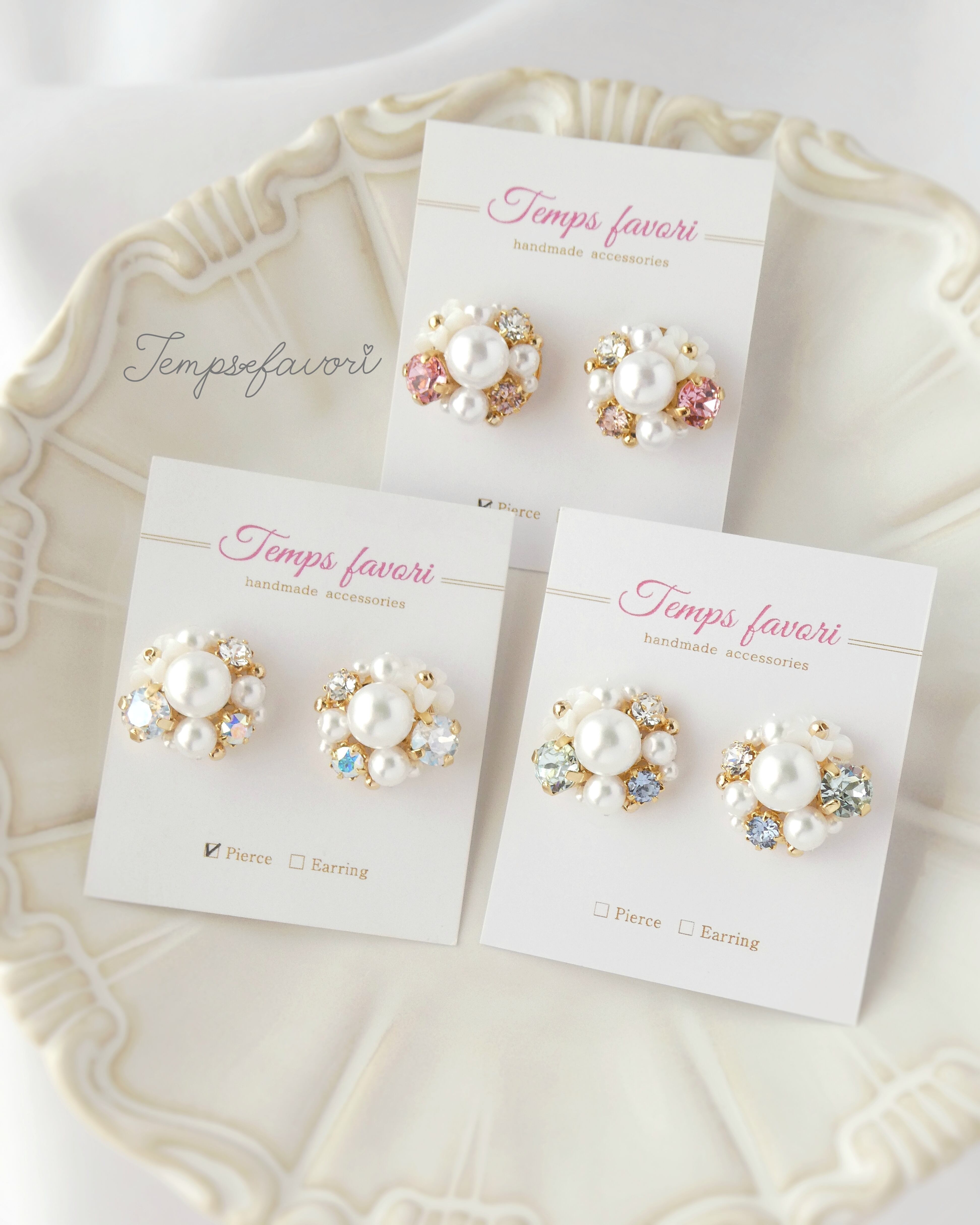 大粒のパールを異なるカラーのビジューとお花が囲む華やかなビジューピアス。